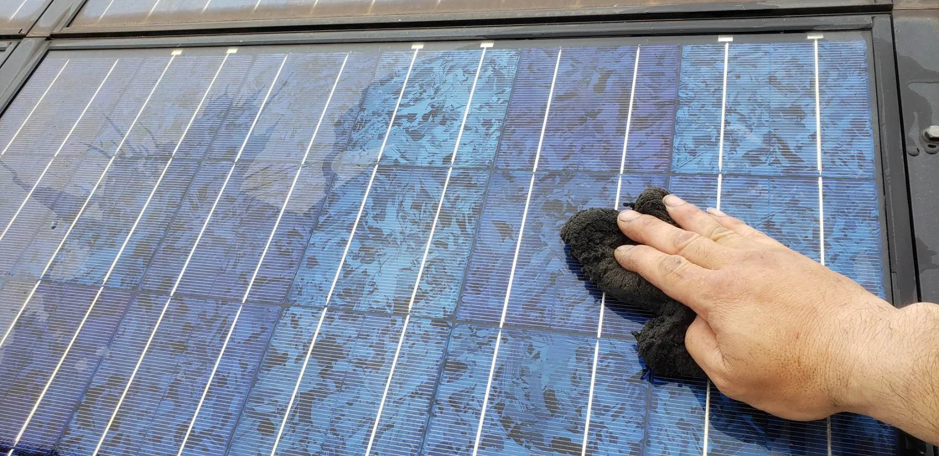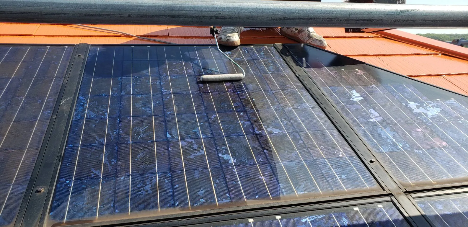 ソーラーパネル復旧後、パネル表面にガラス用光触媒を施工。