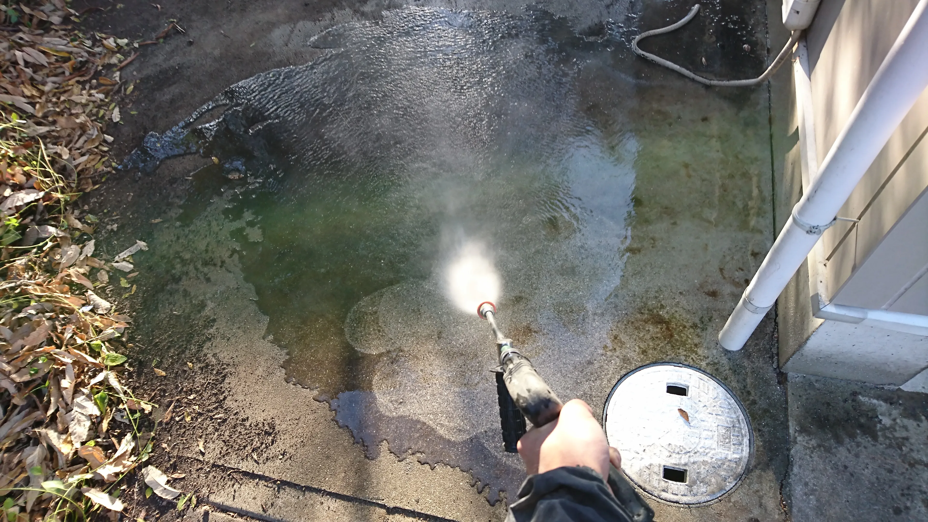 カーポート設置前の事前準備としてコンクリート土間を高圧洗浄で綺麗に洗浄します。