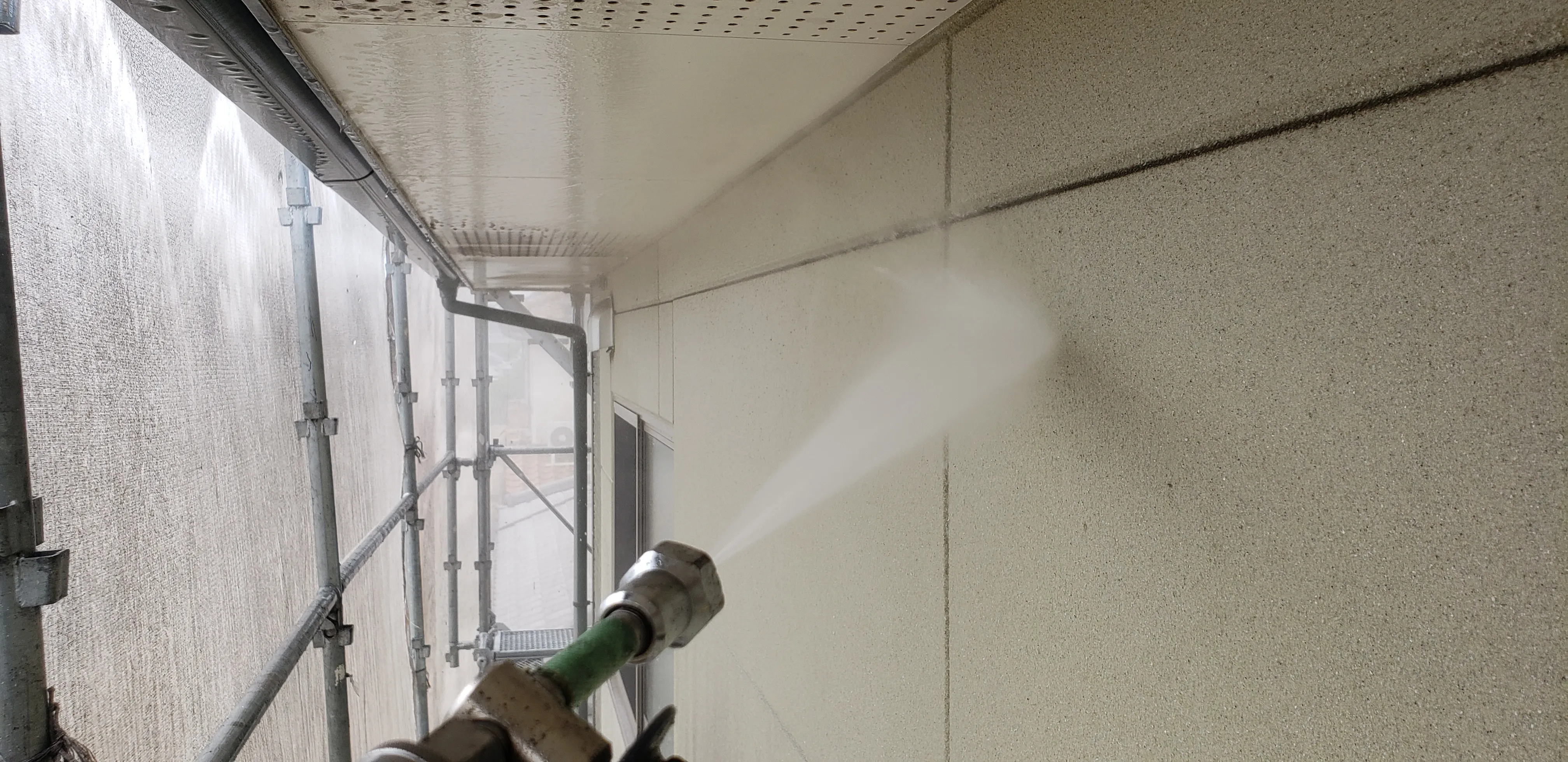 まずは仮設足場を組み立てて高圧洗浄からスタートです。