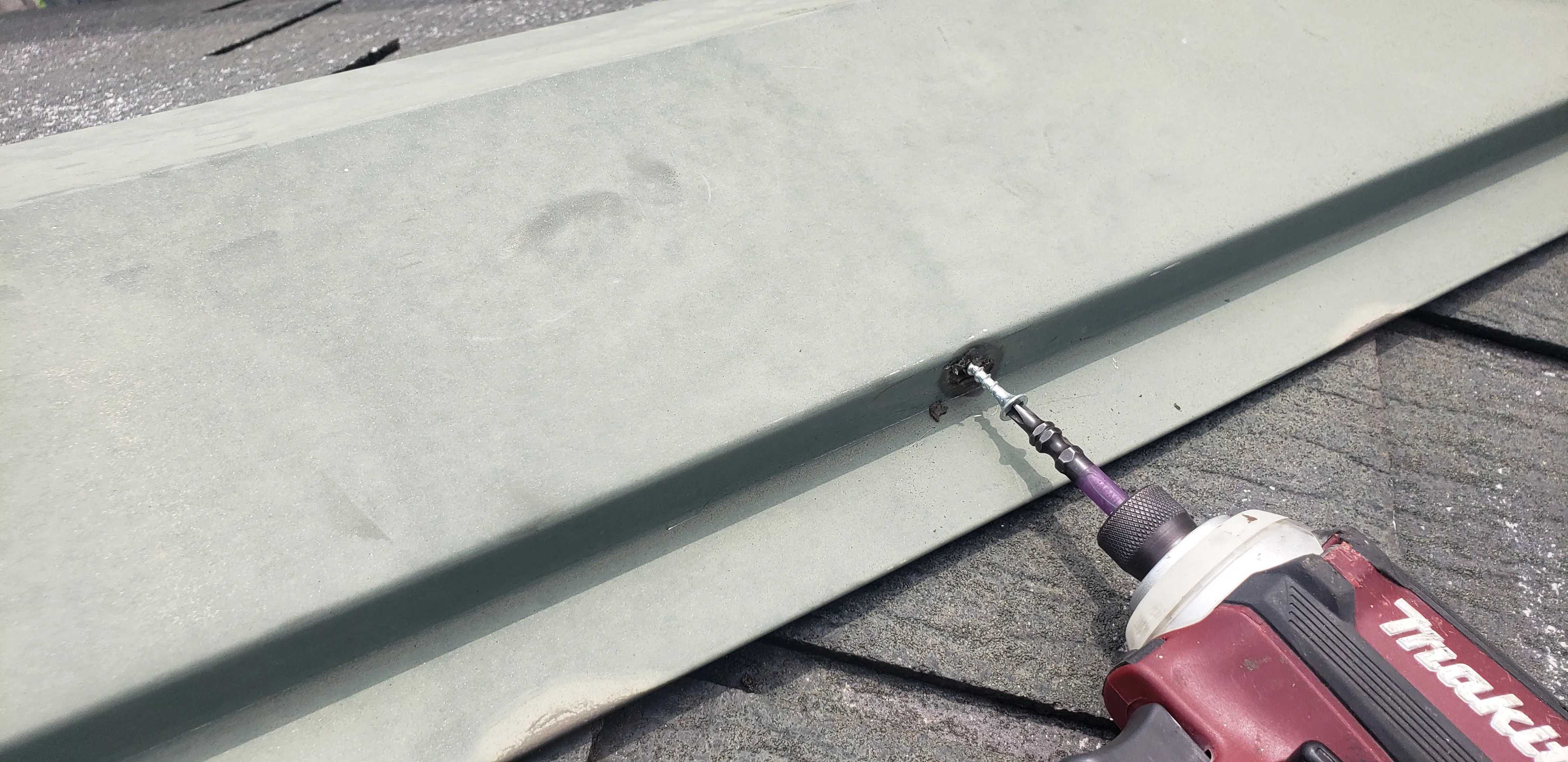 屋根の棟抑えの釘が抜けてきているのでビスに交換していきます。