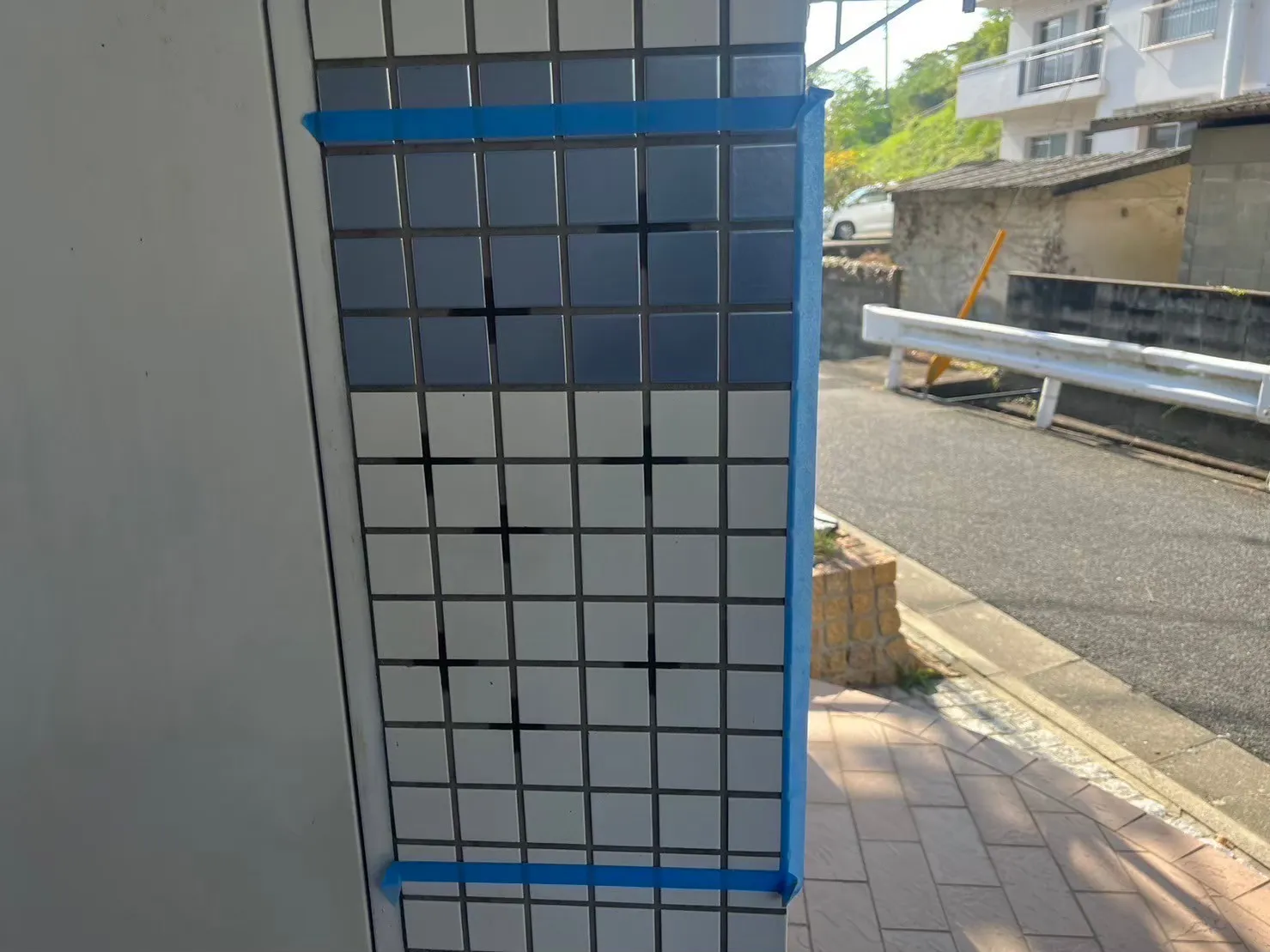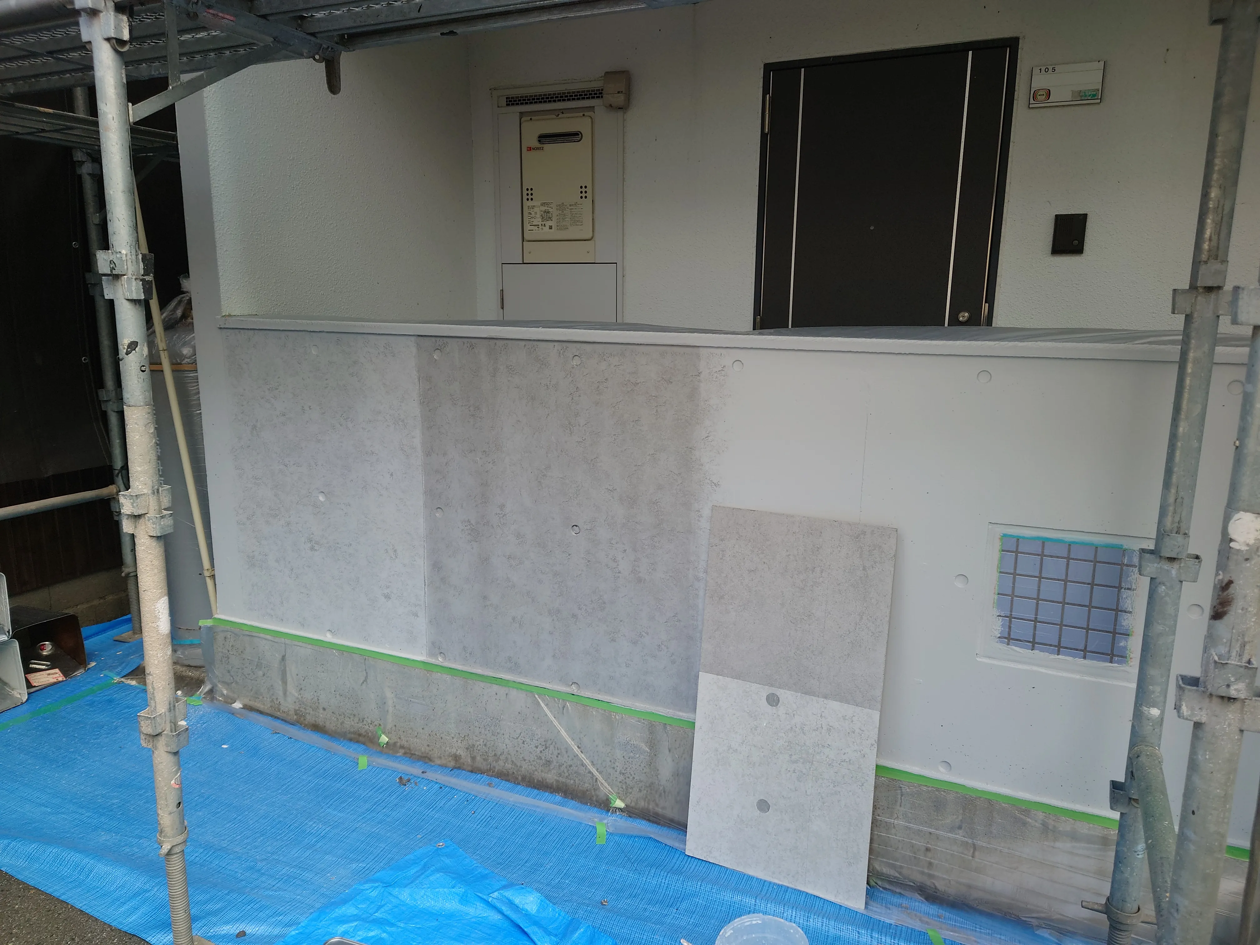 何種類かの見本板及び外壁にお試しで柄を作ります。